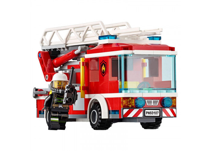 Bij deze set hoort een brandweerladderwagen met uitschuifbare ladder en slang plus een olieton