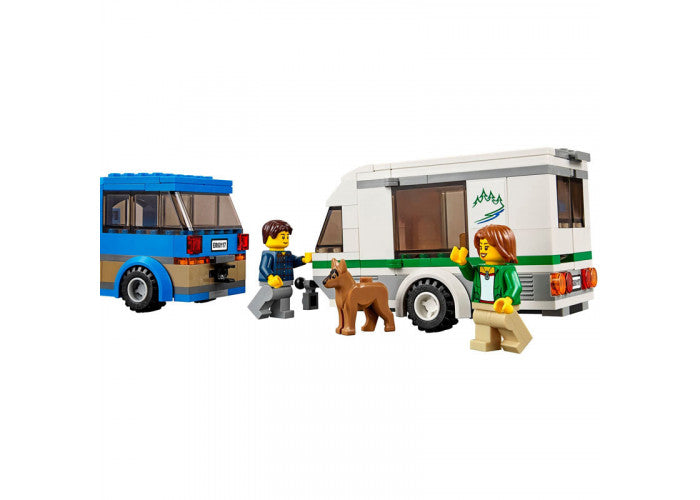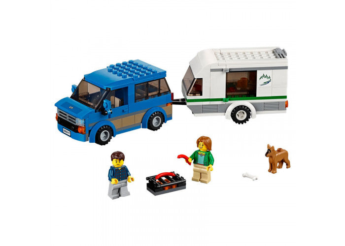 Rij naar de camping in de bestelwagen met de caravan erachter. Parkeer de caravan en je vakantie kan beginnen! In de zomer gaat er niets boven een kampeervakantie in LEGO City!