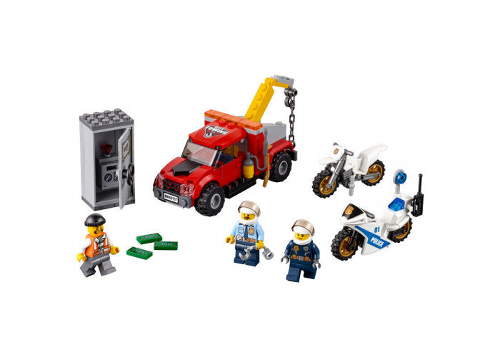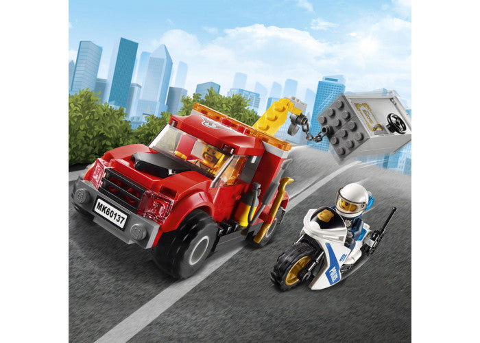 Werk samen met de motoragenten om de boef te vangen! Zet een agent op de terreinmotor of de racemotor en achtervolg de sleeptruck. Arresteer de schurk, zet hem achter de tralies en breng de brandkast terug waar hij hoort. Er gebeurt altijd wel iets spannends bij de LEGO City politie!