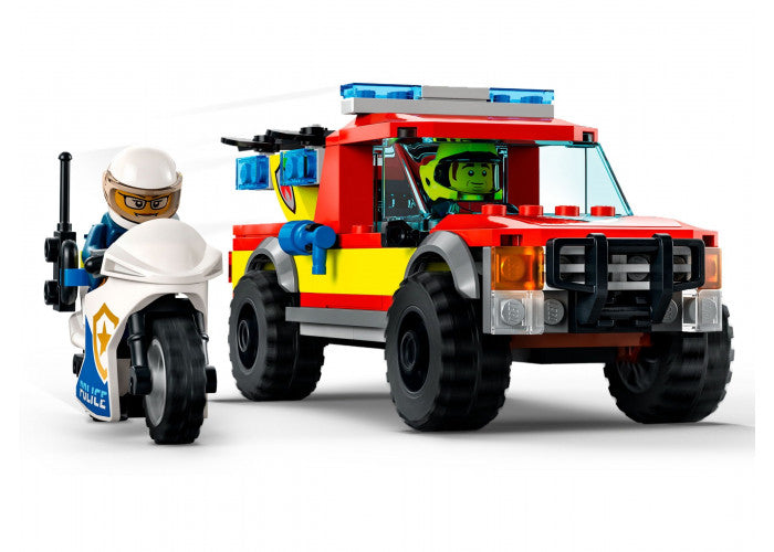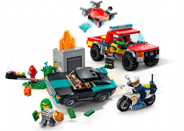 Deze brandweer- en politiewagenset zit boordevol inspirerende details en coole voertuigen, waaronder een hele vloot hulpverleningsvoertuigen: een brandweerwagen met speelgoed drone, een politiemotorfiets en een vluchtwagen van een schurk. Voeg de katfiguur en drie minifiguren toe, waaronder brandweerman Bob uit de tv-serie Lego City Adventures, en het speelplezier kan beginnen! De set bevat een stapsgewijze handleiding met afbeeldingen en interactieve digitale bouwinstructies. De digitale handleiding is onderdeel van de gratis Legobouwinstructies-app voor smartphones en tablets en bevat intuïtieve zoom- en draaifuncties zodat kinderen de modellen vanuit alle hoeken kunnen visualiseren terwijl ze bouwen. Bevat 295 onderdelen. Geschikt voor kinderen vanaf 5 jaar.
