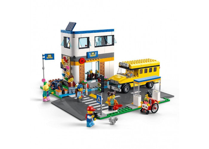 Er wachten de kinderen boeiende schooldagen met deze set, met twee klaslokalen en een speelplaats met klimmuur en hinkelbaan, plus een speelgoedbus en -fiets. De Lego-wegenplaten met speelgoedverkeerslichten, zebrapad en fietspad kunnen ook gebruikt worden om andere sets aan te koppelen. De zeven minifiguren, waaronder twee personages uit de Lego City Adventures-tv-serie, leveren voldoende inspiratie voor fantasierijk speelplezier. De set bevat ook een minifiguur van een lollyverkoopster.Dit Lego-constructiespeelgoed bevat een stapsgewijze, afgedrukte handleiding en interactieve digitale bouwinstructies. De digitale handleiding is onderdeel van de gratis bouwinstructies-app voor smartphones en tablets en bevat intuïtieve zoom- en draaifuncties, zodat kinderen elk model vanuit alle hoeken kunnen visualiseren terwijl ze bouwen. Bevat 433 onderdelen. Geschikt voor kinderen vanaf 6 jaar.